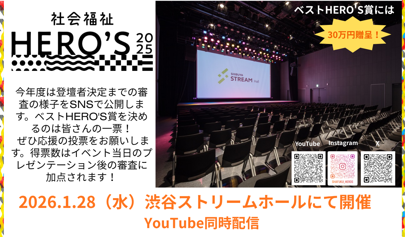 社会福祉の魅力を全国に発信する若手スタッフのプレゼンコンテスト「社会福祉 HERO’S」、今年も開催!会場観覧と YouTube 配信に加え、特別ゲストも登場予定です。 また初の試みとして、登壇者決定までの審査の様子をSNSで公開します!ベストHERO’S賞を決めるのは皆さんの一票。ぜひ応援のほど、よろしくお願いします!