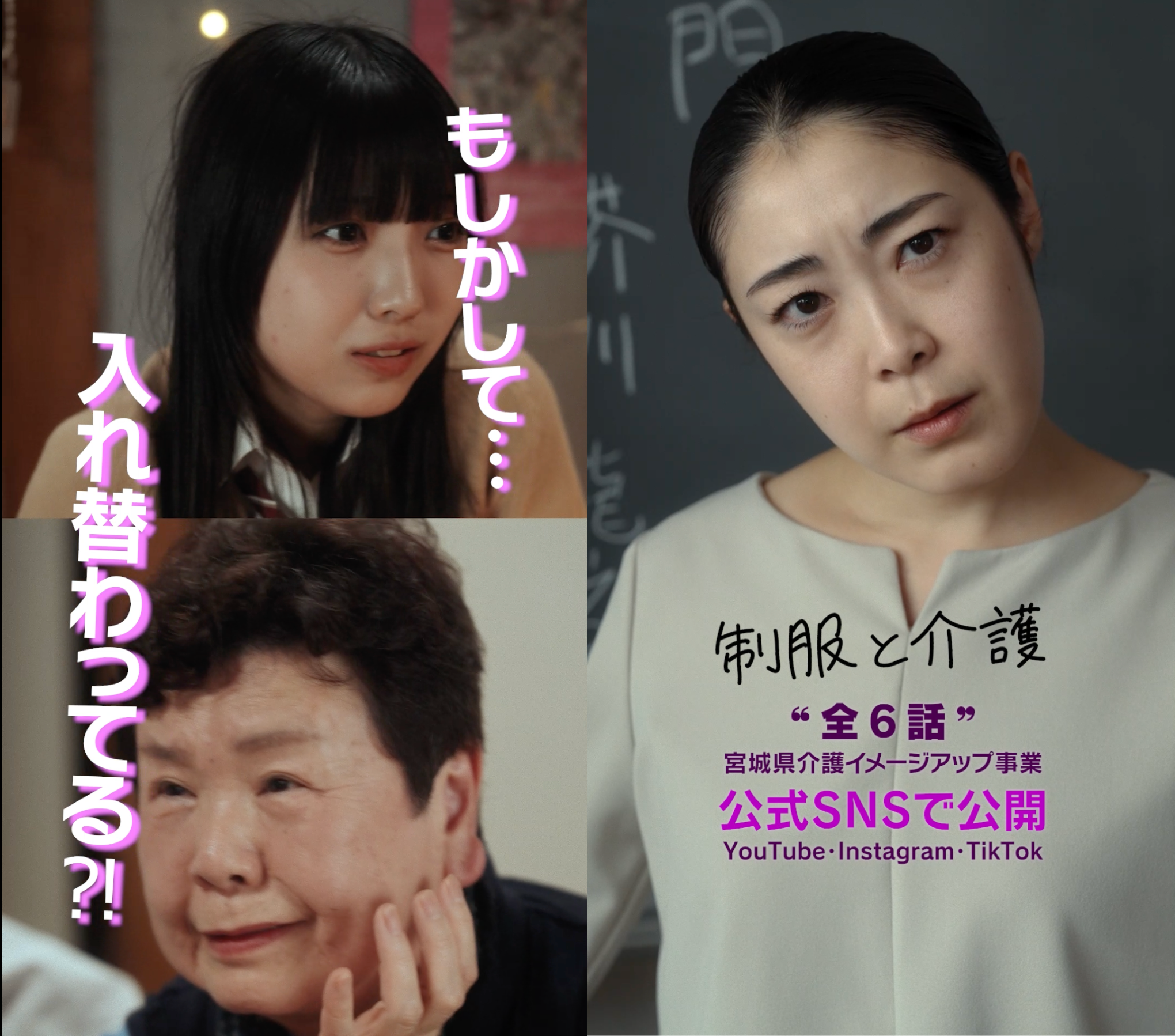 宮城県の「令和7年度宮城県介護イメージアップ実施業務」の一環として制作したショートドラマ『制服と介護』が宮城県公式Instagram/TikTok/YouTubeにて公開中。 誰かの立場になって初めて見える世界がある。 “魂の入れ替わり”という不思議な体験を通して描かれるのは、世代も価値観も超えた「優しさ」の物語。笑って、泣いて、少し心が温かくなるショートドラマのあらすじをお届けします。 高校生のアカリは、友達と一緒にSNSでバズっている“幽体離脱ができる“という儀式を面白半分で検証することに。 アカリは儀式の最中、突然部屋に入ってきた祖母・カズコ(77歳)と、なんと魂が入れ替わってしまう! 見た目はJKなのに中身は77歳のカズコは、約60年ぶりの学校生活へ。 一方、見た目はおばあちゃんになってしまったアカリは、人生初のデイサービスへ通うことに。 はじめは不満だらけだったアカリだが、そこで出会った介護職員・ナツキとの交流を通じ、 介護という仕事に秘められた優しさや『クリエイティブ』さに気づき始める。 果たして二人は無事に元の身体に戻れるのか!? 笑いと涙と優しさが溢れる、魂入れ替わりコメディ! 宮城県では、「介護は単に利用者のお世話をするだけの仕事ではなく、個性を活かし、相手と自分だけの寄り添い方を生み出す『クリエイティブ』な仕事」として介護の魅力を発信しています。 ショートドラマの他、いぎなり東北産メンバーの介護現場の方々へのインタビュー記事や宮城県出身の音楽ユニット「MELOAPPA」が歌う「介護オリジナルソング」も公式サイトにて掲載していますので、ぜひご覧ください!