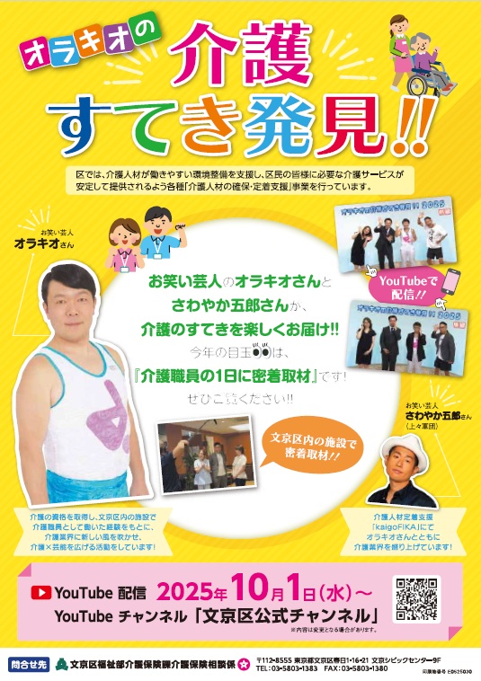 介護の魅力ってなんだろう?? 介護の仕事って実際にどんなことをしているの?? そんな疑問にお答えすべく、前編と中編では、文京区内の介護サービス事業所に所属する若手介護職員の働く様子に密着し、仕事内容をわかりやすく紹介しています。若手介護職員の意外な素顔や本音が聞けちゃうかも!? 後編では、文京区内の介護サービス事業所で働いている職員の方向けの文京区独自事業をご紹介! 介護業界を盛り上げるお笑い芸人のオラキオさん、さわやか五郎さん(上々軍団)と一緒に、介護のすてきを発見してみませんか?? ぜひご覧ください!!