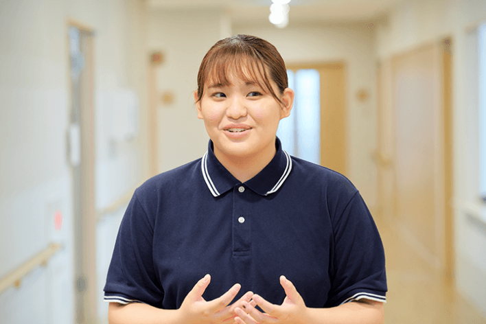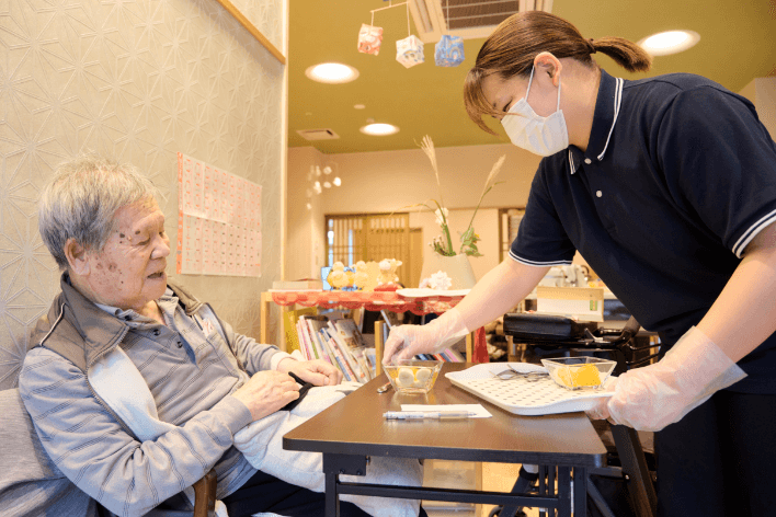 ごはんやおやつを配膳しているとき、入居者さんたちに「ありがとう」と言われ、うれしかったですね。初めは果物を「食べない」と言っていた入居者さんが、直接お渡しすると「じゃあ、食べる」と前向きになってくださり、自分のちょっとした働きかけが良い影響を与える、やりがいのある仕事だと感じました。