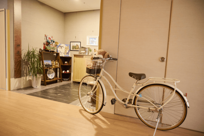 この施設では、入居者さんは3つのエリア(ユニット)に分かれて生活されていて、それぞれに戸建ての家のような玄関があって、入口に異なる装飾をすることで、入居者さんが自分の住んでいるエリアに戻れるように工夫されています。施設を建てるときに現場からの意見を聞き、反映しているということで、たとえばトイレは車いすからスムーズに降りられるように動線を考慮して便器が設置されているなど、細かい心配りがされた設備に驚きました。